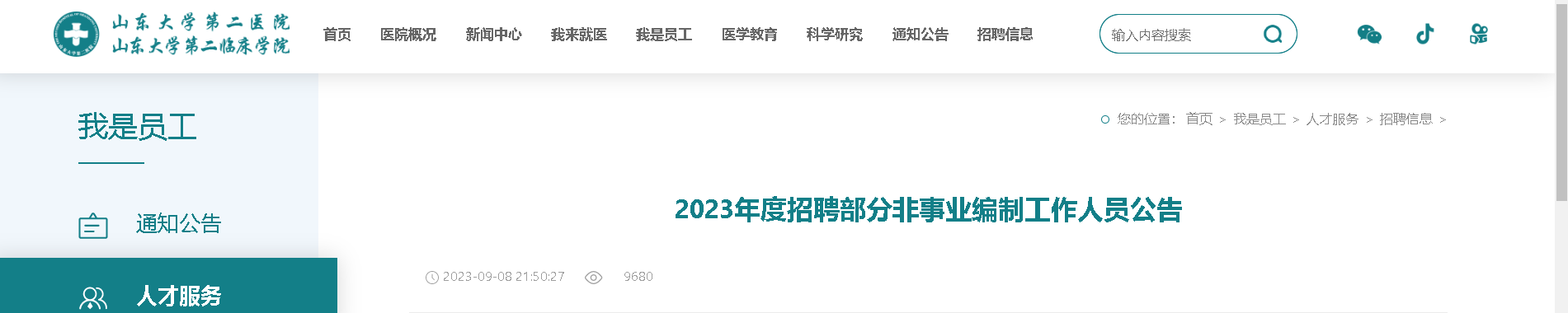 2023山東大學(xué)第二醫(yī)院招聘部分非事業(yè)編制工作人員14人,報(bào)名時(shí)間:發(fā)布本公告起,截止至2023年9月22日17:00,現(xiàn)將招聘公告原文發(fā)布如下: