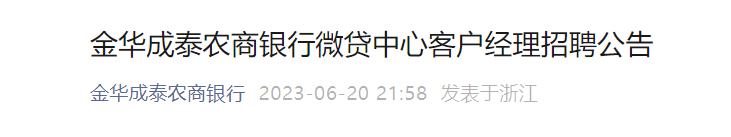 2023年浙江金華成泰農(nóng)商銀行微貸中心客戶經(jīng)理招聘公告已發(fā)布,報(bào)名時(shí)間:2023年7月20日17:00截止,現(xiàn)將招聘公告發(fā)布如下: