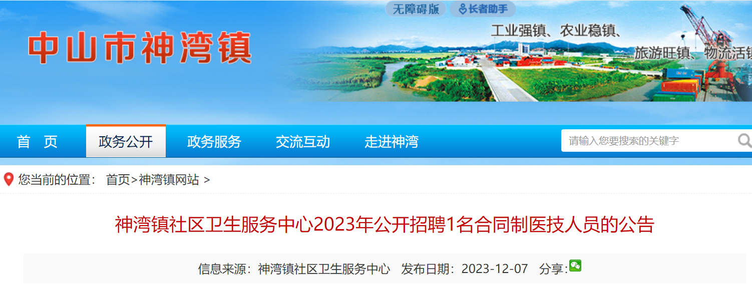 2023年廣東中山市神灣鎮(zhèn)社區(qū)衛(wèi)生服務(wù)中心招聘合同制醫(yī)技人員1人,報(bào)名時(shí)間:2023年12月7日上午8:30至2023年12月16日下午17:30?,F(xiàn)將招聘公告原文發(fā)布如下: