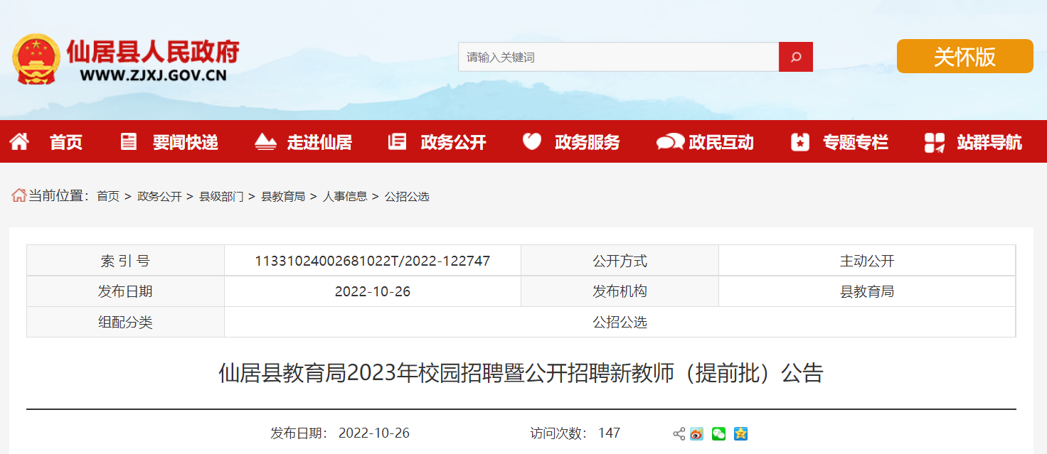 2023年浙江臺(tái)州仙居縣教育局校園招聘暨公開(kāi)招聘新教師(提前批)公告已發(fā)布,網(wǎng)上報(bào)名時(shí)間為2022年10月26日至11月4日下午5點(diǎn)止?,F(xiàn)將招聘公告原文發(fā)布如下: