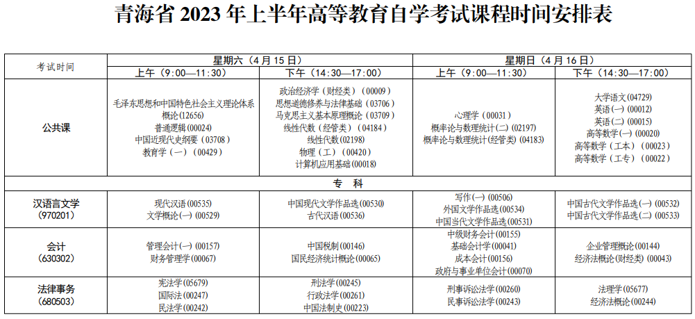 2、課程安排:各專業(yè)課程考試安排詳見本簡章《青海省2023年上半年高等教育自學(xué)考試課程時間安排表》。