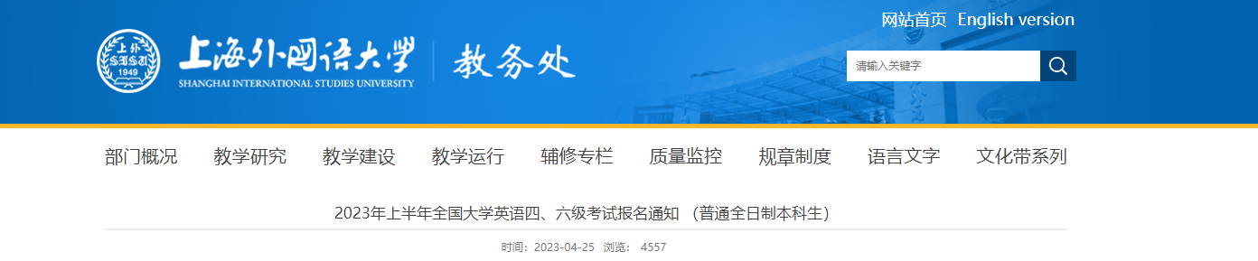 從上海外國(guó)語(yǔ)大學(xué)教務(wù)處獲悉,2023年上半年上海外國(guó)語(yǔ)大學(xué)英語(yǔ)四、六級(jí)考試報(bào)名通知已公布,報(bào)名時(shí)間5月8日前,具體詳情如下: