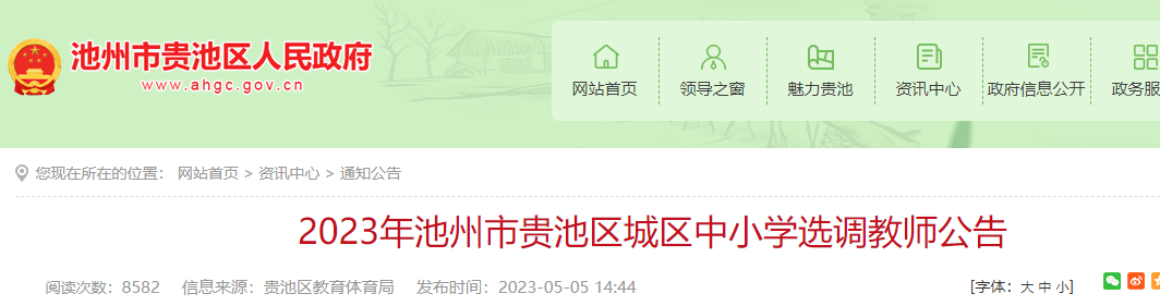 選調(diào)公告、崗位等信息于2023年5月5日起在貴池區(qū)人民政府網(wǎng)(http://www.ahgc.gov.cn/)發(fā)布。