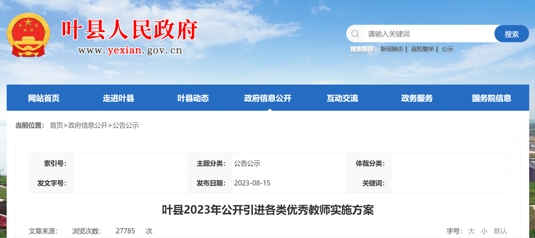 2023年河南平頂山葉縣公開引進各類優(yōu)秀教師實施方案已發(fā)布,報名時間:2023年8月18日8:00至8月24日18:00,現(xiàn)將原文發(fā)布如下: