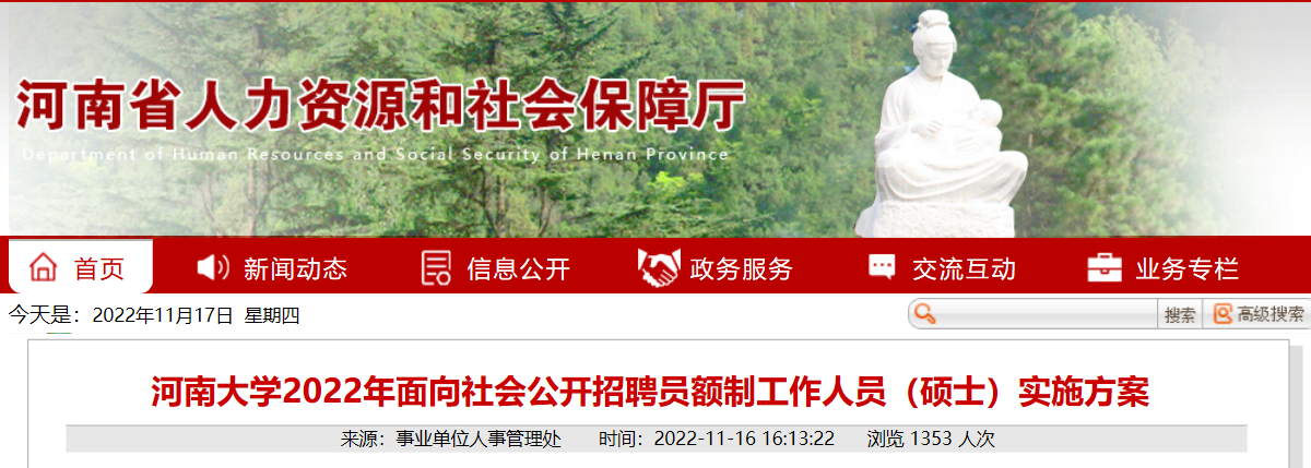 本招聘方案經(jīng)河南省人力資源和社會(huì)保障廳審核備案后,同時(shí)發(fā)布在河南省人力資源和社會(huì)保障廳網(wǎng)站和河南大學(xué)網(wǎng)站。發(fā)布時(shí)間為2022年11月16日至2022年11月24日。