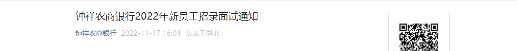 鐘祥農(nóng)商行2022年新員工招錄面試時間為11月19日。