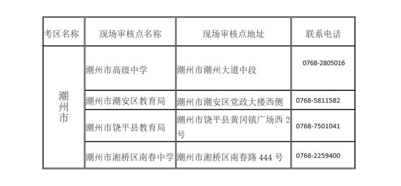 潮州市高級中學審核全市(包括韓山師范學院)申報高級中學、中等職業(yè)學校和中等職業(yè)學校實習指導面試資格的考生,審核時間:2022年12月12日-14日,上午8:30—11:30,下午2:30—5:30;