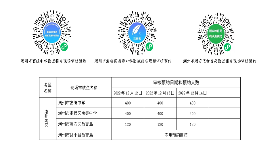 潮安區(qū)教育局審核潮安區(qū)、楓溪區(qū)轄區(qū)范圍內(nèi)申報初級中學、小學和幼兒園面試資格的考生,時間:2022年12月12日-14日,上午8:30—11:30,下午2:30—5:30;