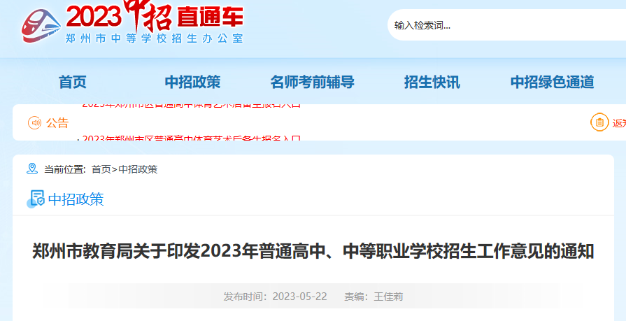 從中招直通車-鄭州教育信息網(wǎng)獲悉,2023年河南鄭州普通高中、中等職業(yè)學(xué)校招生工作意見(jiàn)的通知已公布,具體詳情如下: