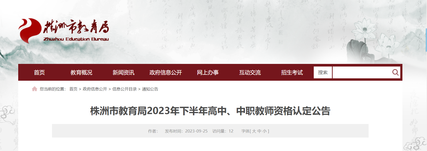 從株洲市教育局獲悉,2023下半年湖南株洲高中、中職教師資格認(rèn)定公告已公布,請(qǐng)相關(guān)人員仔細(xì)閱讀,具體詳情如下: