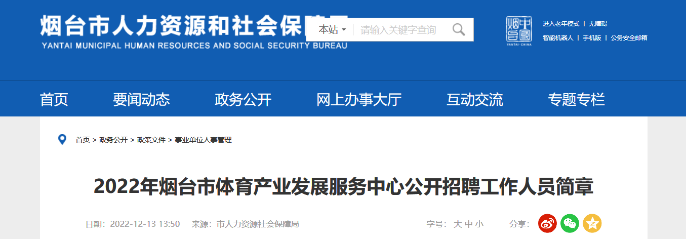 2022山東煙臺市體育產(chǎn)業(yè)發(fā)展服務(wù)中心招聘4人。報名時間:2022年12月19日9:00-12月21日16:00;現(xiàn)將公告原文發(fā)布如下: