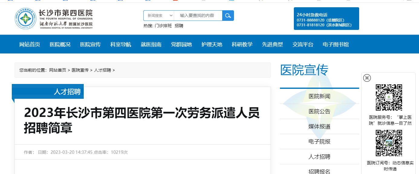 2023湖南長沙市第四醫(yī)院第一次勞務派遣人員招聘92人,網(wǎng)絡(luò)報名時間:2023年3月24日(周五)09:00—3月26日(周日)17:00,現(xiàn)將招聘公告原文發(fā)布如下: