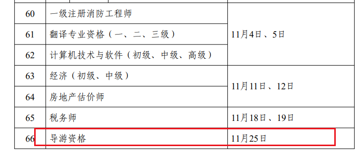 從人力資源社會保障部辦公廳發(fā)布的《關于2023年度專業(yè)技術人員職業(yè)資格考試計劃及有關事項的的通知》得知,2023年河南導游資格考試時間已公布,11月25日舉行考試,具體詳情如下: