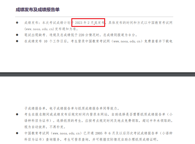 答:當(dāng)次考試成績(筆試及口試)于考試結(jié)束后60個工作日發(fā)布,2023年2月底公布成績!具體發(fā)布的時間和方式以中國教育考試網(wǎng)(www.neea.edu.cn)發(fā)布的公告為準。