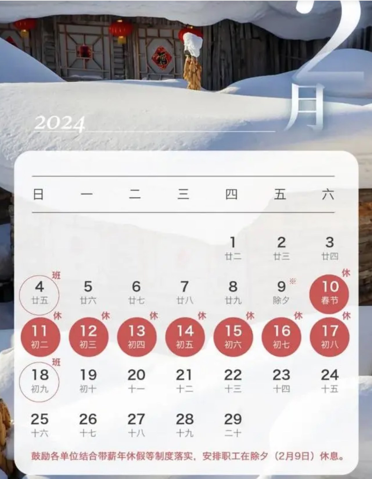 二、春節(jié):2月10日至17日放假調(diào)休,共8天。2月4日(星期日)、2月18日(星期日)上班。鼓勵各單位結合帶薪年休假等制度落實,安排職工在除夕(2月9日)休息。