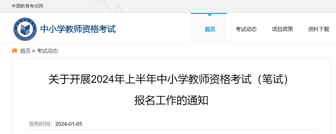 從中國教育考試網(wǎng)獲悉,2024上半年中小學(xué)教師資格考試筆試報名工作的通知已公布,1月12日開始報考,具體詳情如下: