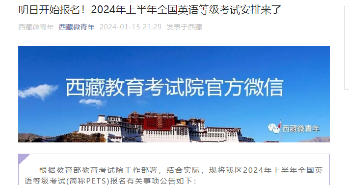 從西藏教育考試院獲悉,西藏2024上半年全國(guó)英語(yǔ)等級(jí)考試安排已公布,今日起報(bào)考,具體詳情如下: