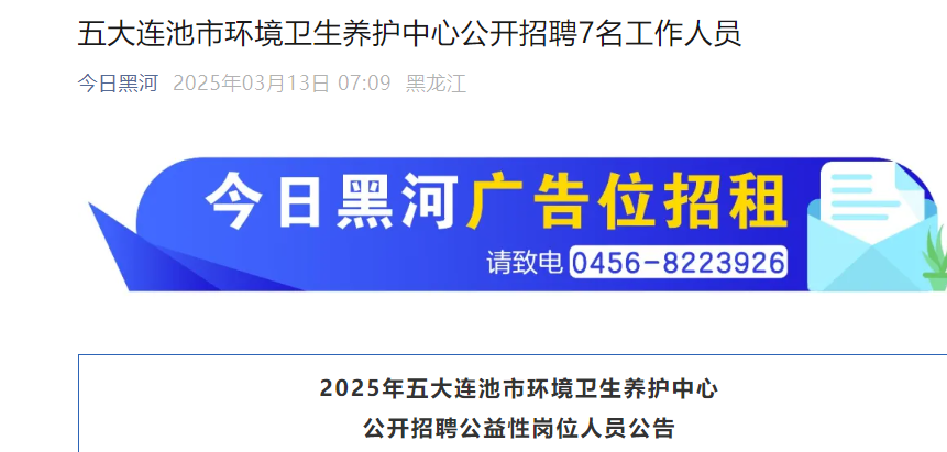 小編根據(jù)五大連池市環(huán)境衛(wèi)生養(yǎng)護(hù)中心發(fā)布“五大連池市環(huán)境衛(wèi)生養(yǎng)護(hù)中心公開(kāi)招聘7名工作人員”得知,2025黑龍江黑河市五大連池市環(huán)境衛(wèi)生養(yǎng)護(hù)中心招聘7人,報(bào)名時(shí)間為2025年3月11日-3月17日。
