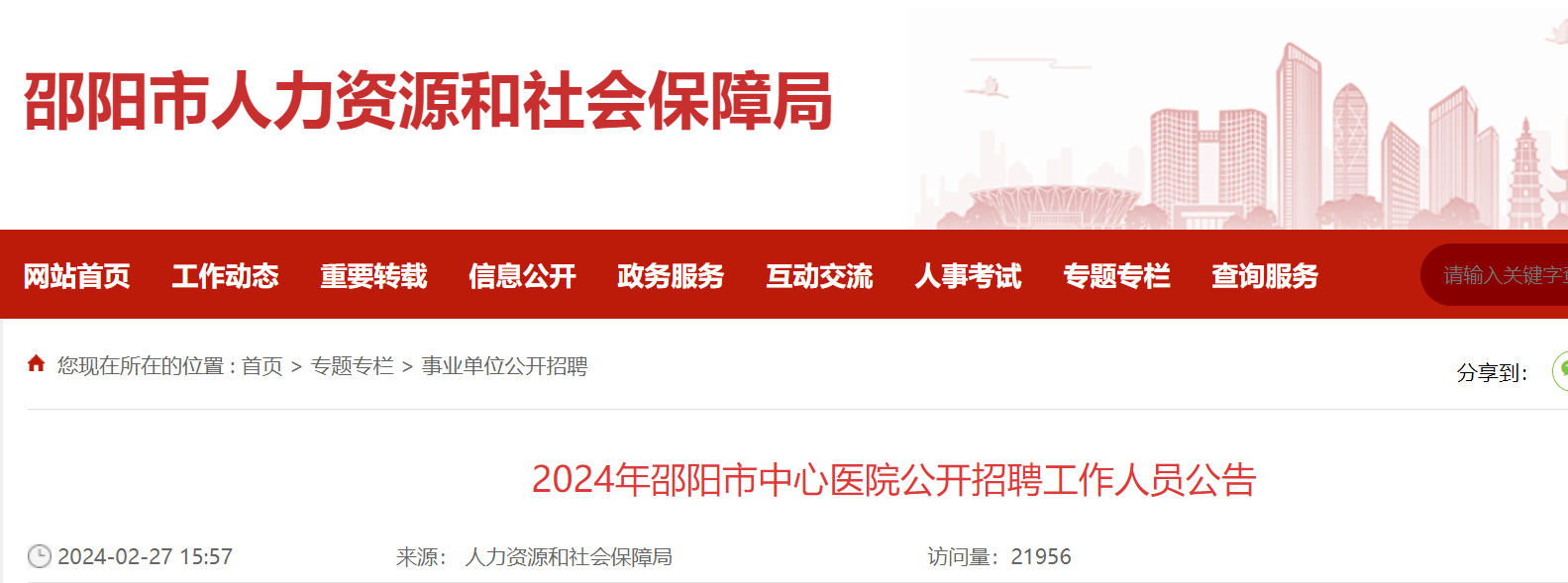 2024年湖南邵陽市中心醫(yī)院公開招聘工作人員公告已發(fā)布,報(bào)名時(shí)間:自2024年3月7日8:00起至2024年3月13日17:30止。現(xiàn)將招聘公告原文發(fā)布如下: