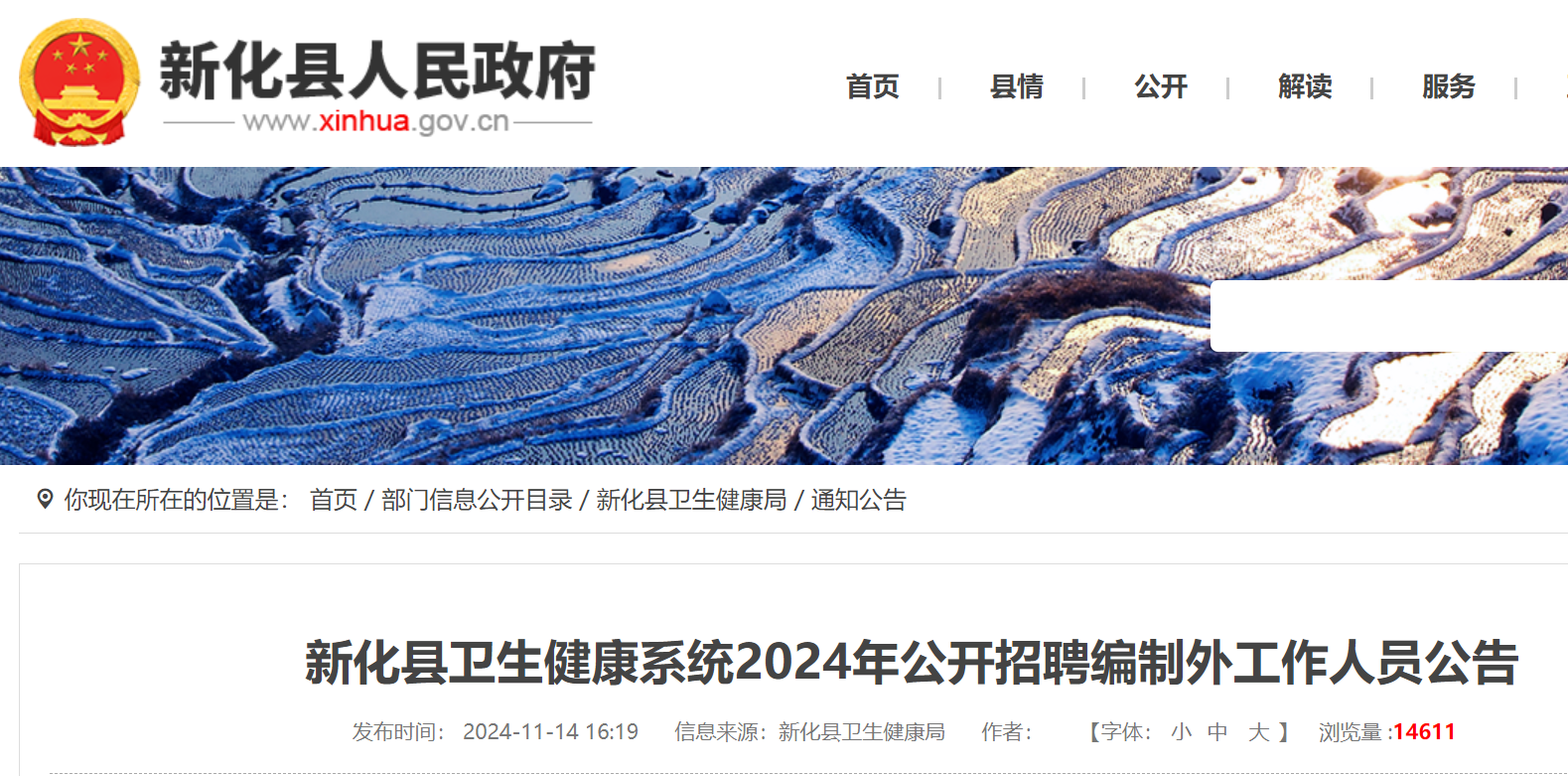 2024年湖南婁底新化縣衛(wèi)生健康系統(tǒng)公開招聘編制外工作人員公告已發(fā)布,報名時間:2024年11月23日至11月25日(上午8:00—12:00,下午14:30—17:30,節(jié)假日不休息)?,F(xiàn)將招聘公告原文發(fā)布如下:
