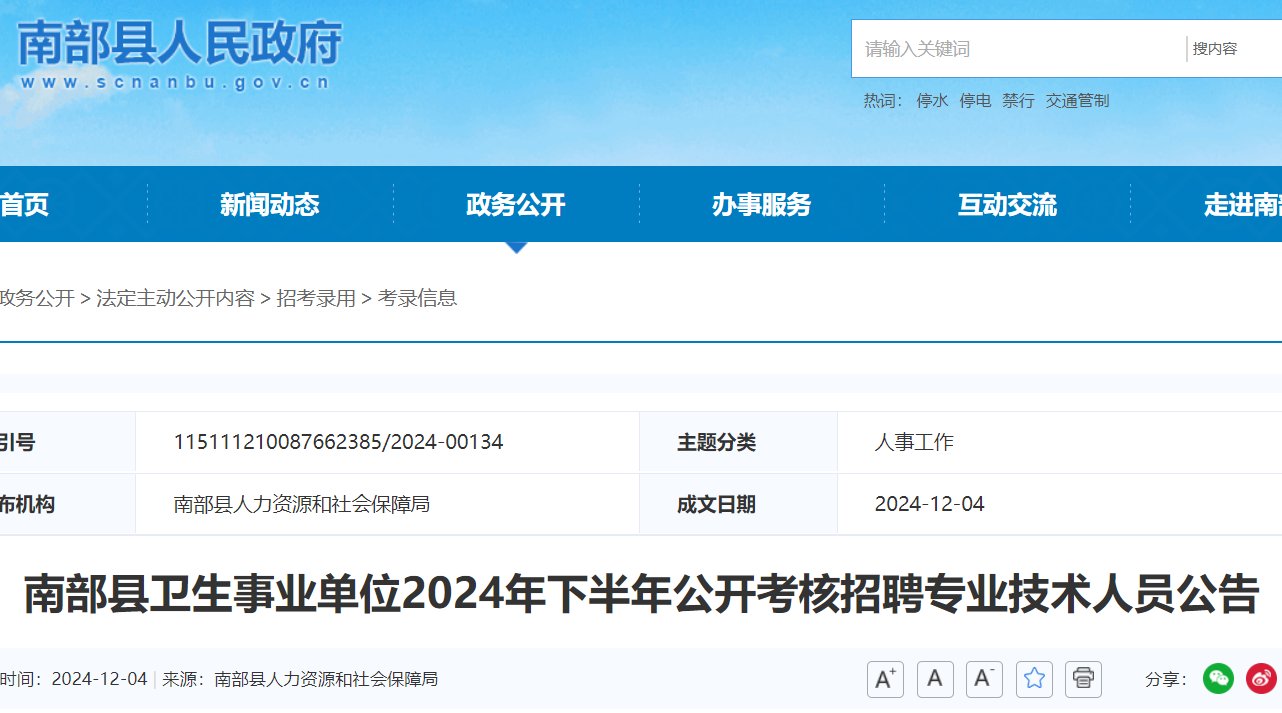 1.公招過程中如有調(diào)整、補充等事項,由中共南部縣委組織部(縣委人才辦)、南部縣人力資源和社會保障局在南部縣人民政府網(wǎng)站通知或公告,請考生隨時關(guān)注。因報考者不主動、不按要求登錄相關(guān)網(wǎng)站查閱相關(guān)信息,導(dǎo)致本人未能按要求參加面試、體檢、考察、聘用的,責(zé)任自負(fù)。