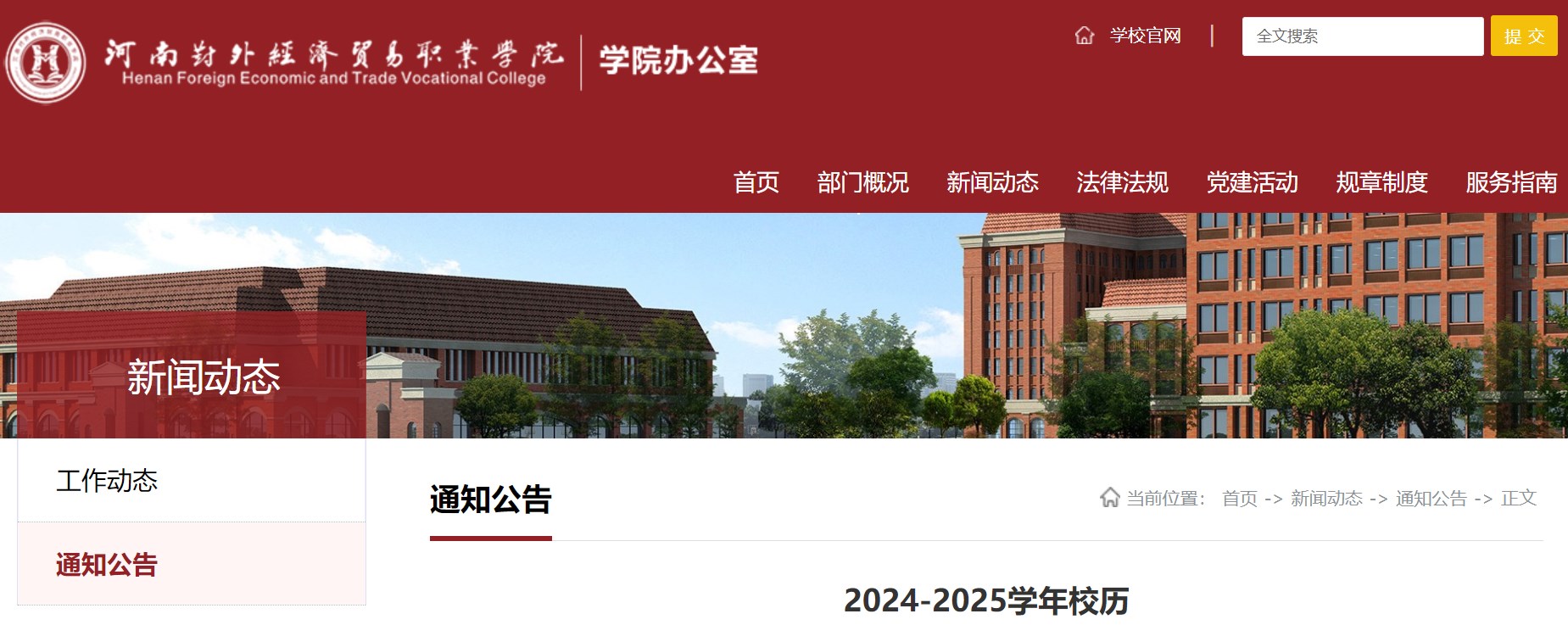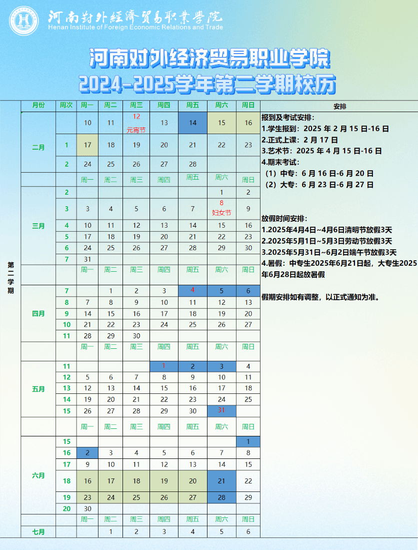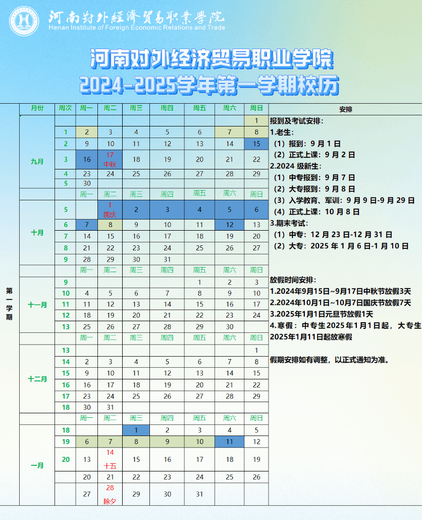 2024-2025學(xué)年河南對外經(jīng)濟貿(mào)易職業(yè)學(xué)院校歷已出爐,1月11日放寒假?,F(xiàn)將原公告公布如下:
