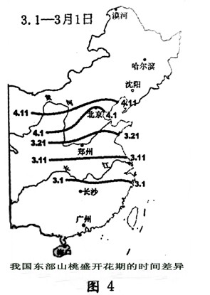 24.造成圖中我國(guó)東部山桃盛開(kāi)花期時(shí)間差異的影響因素是( )