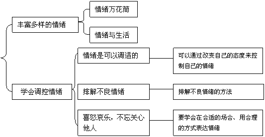 ⑵啟示:①人的情緒需要調(diào)控;②調(diào)控情緒有很多具體方法,可以根據(jù)不同的情況和個(gè)人的特點(diǎn)靈活地加以運(yùn)用;③喜怒哀樂(lè),不忘關(guān)心他人;④我們應(yīng)該學(xué)會(huì)在合適的場(chǎng)合、用合理的方式發(fā)泄自己的情緒。