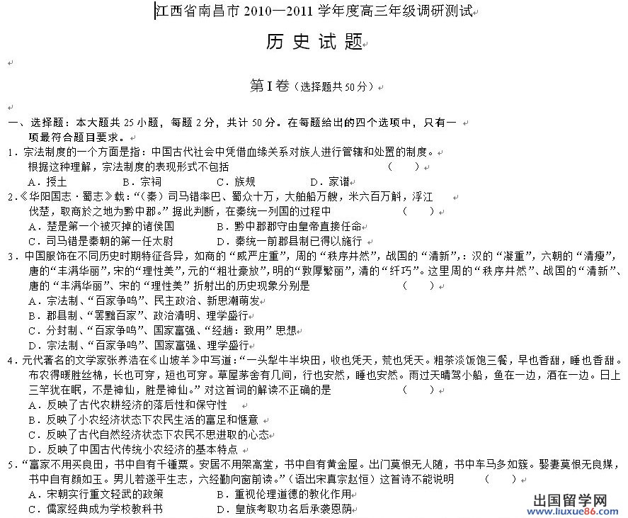 2012年05月23日 親,很高興訪問《江西省南昌市2011屆高三上學(xué)期調(diào)研測(cè)試歷史試題及答案》一文,也歡迎您訪問出國留學(xué)(liuxue86.com)的高考頻道,為您精心準(zhǔn)備了2011高考?xì)v史日常練習(xí)的相關(guān)模擬考試試題內(nèi)容!同時(shí),我們正在加緊建設(shè)高考頻道,我們?nèi)w編輯的努力全是為了您,希望您能在本次高考中能獲得好的名次,以及考上滿意的大學(xué),也希望我們準(zhǔn)備的《江西省南昌市2011屆高三上學(xué)期調(diào)研測(cè)試歷史試題及答案》內(nèi)容能幫助到您。在即將到來的高考上助您一臂之力!加油,童鞋!