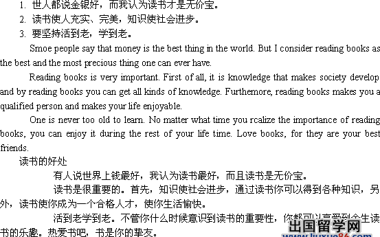 讀書是很重要的。首先,它是知識(shí),使社會(huì)發(fā)展和通過(guò)讀書你可以得到各種知識(shí)。在封閉式,讀書使你成為一個(gè)合格的人才,使你生活愉快。
