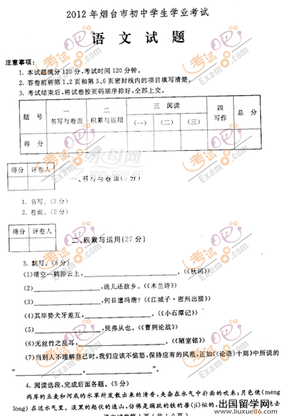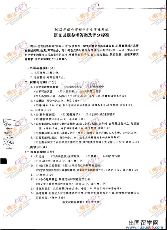 >>>2012全國中考試題及答案<<<