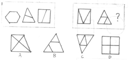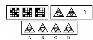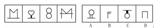 國家公務(wù)員考試網(wǎng)(https://www.liuxue86.com/gongwuyuan//)解析 第1道C,本題所有圖形均為左右對稱的,將左邊的一半去掉,剩下的右半邊依次為數(shù)字1234,據(jù)此,可知后面為5。 第2題A,解析:去異存同,前圖為:第一個圖形與第二個圖形重合,相同部分余下.第二套圖也如此 第3題C,第一套圖是逆時間轉(zhuǎn),每轉(zhuǎn)90度加下面+一橫,第二套圖是從有小圓的90度扇形,開始逆時間旋轉(zhuǎn),每旋轉(zhuǎn)一次,原有小圓的90度扇形+一個小圓,其他的90度扇形也加一個圓。同理第3個圖是:再圖2的基礎(chǔ)上再轉(zhuǎn)90度,也是每轉(zhuǎn)一次原有小圓扇形再+一個小圓,其他地方也同樣加一個小圓,根據(jù)以上的規(guī)律,能符合此規(guī)律的只有C項。 第4題C,異色相加為黑,同色相加為白 第5題B,解析:(方法一)把內(nèi)分割線,分割出來的兩個圖形分別算出其比劃再組成這個圖行總的筆劃(重合的線段算為2劃)。根據(jù)這個規(guī)律:第一套圖的筆劃是:6,7,8,第二套圖的筆劃是:9,10,11。(方法二)看內(nèi)角的個數(shù)呈規(guī)律遞增;第一套圖:6,7,8,第二套圖:9,10,11