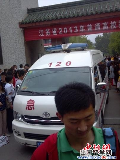 首場考試結(jié)束后,安全載著晴晴的急救車緩緩從考場開出。 拾冠之 攝 中新網(wǎng)徐州6月7日電 (拾冠之)江蘇省徐州市銅山區(qū)鄭集高級中學(xué)兩名高三學(xué)生彬彬、晴晴在高考前夕分別突發(fā)腦出血、急性白血病,入院治療期間兩個孩子都不愿放棄考試,但醫(yī)院、教育部門均不建議“帶病上陣”。經(jīng)協(xié)商,6月6日晚,彬彬和家人艱難地做出選擇“放棄高考”,而晴晴則堅持上考場實現(xiàn)高考夢。