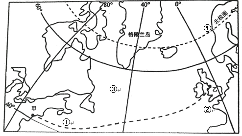 圖1中格陵蘭島大部分終年被冰雪覆蓋,甲、乙分別是北美洲和英國的港口,甲乙之間的虛線示意航線。十八世紀(jì)郵政長(zhǎng)官富蘭克林調(diào)查發(fā)現(xiàn),沿北美洲和英國之間航線航行的郵船,往、返航程耗時(shí)明顯不同。據(jù)此完成1~2題。