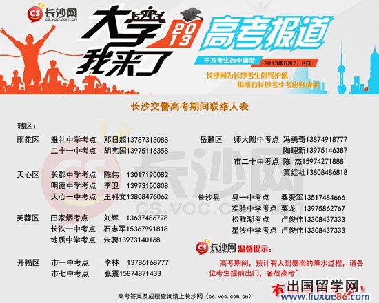 與高考無關(guān)的市民在高考期間駕車出行盡量避開考點(diǎn)周邊的清水塘路、曙光路、勞動(dòng)路、人民路、城南路、德雅路、新建路、麓山路、桃子湖路、銀盆路、銀雙路等考點(diǎn)周邊道路。