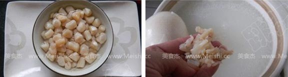 5、燒開,加入干貝絲,轉(zhuǎn)中小火繼續(xù)熬煮(中間要用勺子不斷推下以免糊鍋的)