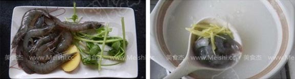 4、至米飯熬成粥,這時候可以加入姜絲和蝦仁,再煮上5分鐘左右