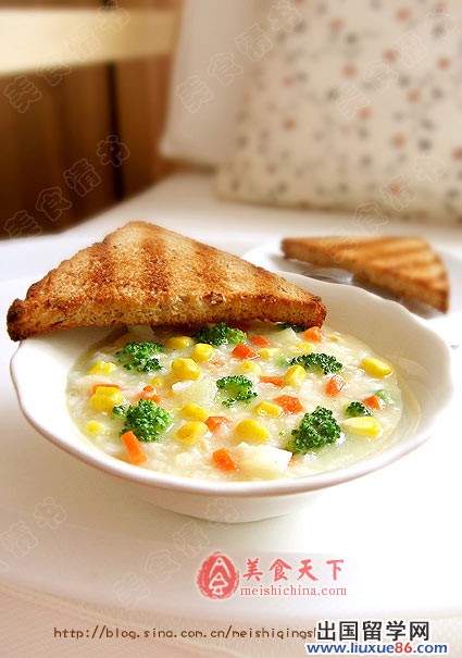 棒渣50克、大米30克、玉米面20克、即食燕麥片20-30克、清水適量(做成粥或稀飯都可以)、玉米粒、豌豆粒、胡蘿卜粒、土豆丁、西蘭花各少許(根據(jù)自己的需要和口味來(lái)放蔬菜就行,種類和多少都隨意。