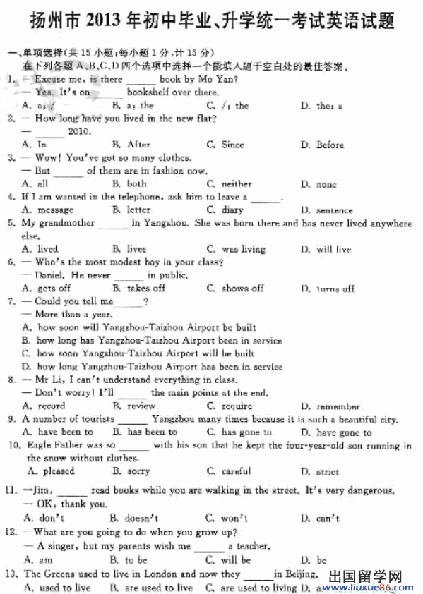 一次考試不是一次重大命運(yùn)轉(zhuǎn)折,只是一次對(duì)知識(shí)掌握程度的評(píng)測(cè)。為了能給大家第一時(shí)間內(nèi)分享中考英語試題的相關(guān)信息,出國留學(xué)網(wǎng)會(huì)及時(shí)更新出所需要的信息資料,供2014年揚(yáng)州中考考生們?yōu)閺?fù)習(xí)做準(zhǔn)備,請(qǐng)屆時(shí)關(guān)注。(CTRL+D即可收藏)