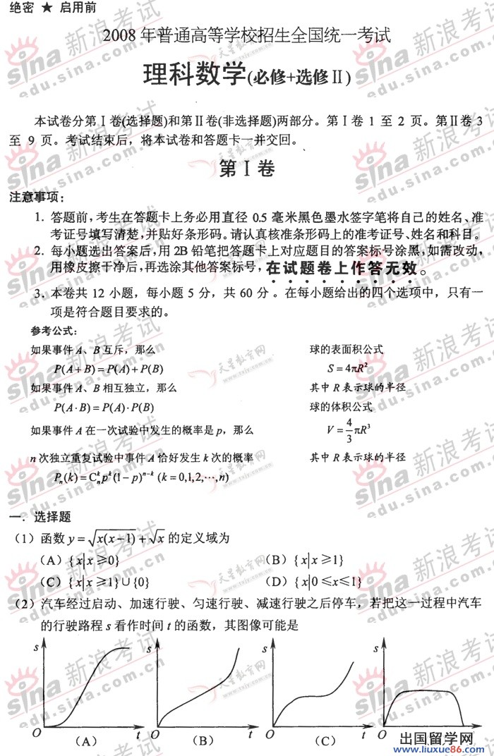 以下是出國留學(xué)網(wǎng)高考頻道為您提供的全國I高考數(shù)學(xué)理真題試卷2008,希望對您2014年高考有所幫助!