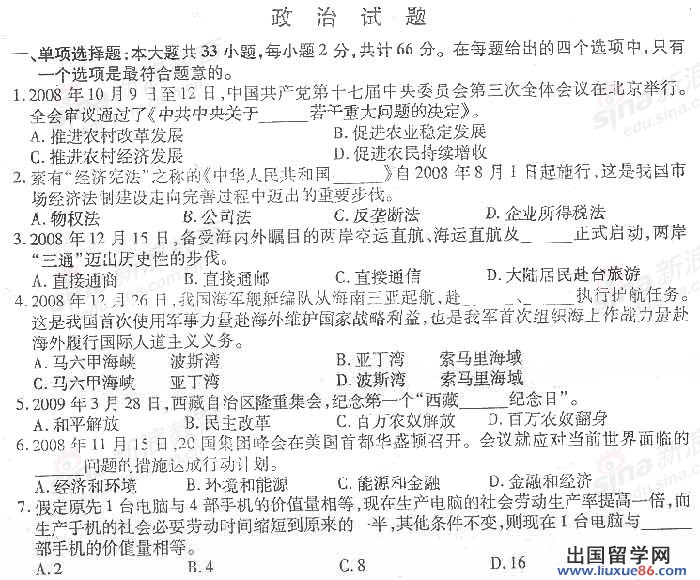 出國留學網(wǎng)高考頻道為您免費提供《江蘇高考政治真題試卷2009》,希望對您2014年高考有所幫助!