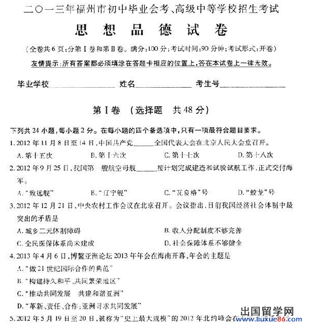 2013年中考已經(jīng)結(jié)束,學(xué)子們一定十分關(guān)注成績(jī)線的指標(biāo),小編也是和大家一樣。為了能給大家在2014年中考考試考出好成績(jī),小編已在出國留學(xué)網(wǎng)分享2013年福州中考政治試題及答案。(CTRL+D即可收藏)