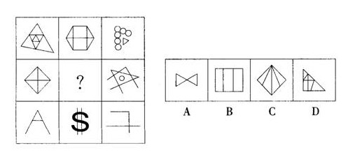 2.解析:題干圖形的顯著特點(diǎn)是有很多重復(fù)出現(xiàn)的小圖形,仔細(xì)對(duì)比來(lái)看,第一行和第二行的組成元素相同,由此得出問(wèn)號(hào)處的圖形應(yīng)是由一個(gè)圓和一個(gè)黑色菱形組成,答案為C。