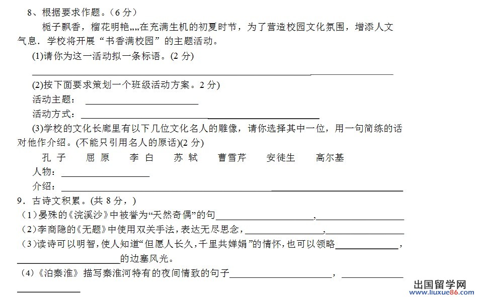 8 (1)示例一:書是人類進(jìn)步的階梯。 示例二:讓花香伴隨書香,讓名家走進(jìn)心靈。 可引用名言,也可以自擬。符合活動(dòng)主題即可。(2)示例:活動(dòng)主題:閱讀名著,陶冶情操活動(dòng)方式:①請(qǐng)作家到班上舉辦專題講座 ②舉行“我愛文學(xué)”的主題班會(huì) ③舉辦”閱讀名著”的手抄報(bào)比賽。 (3)提示:能抓住名人特點(diǎn),與名人生平事跡吻合,語言簡(jiǎn)練即可。(人物不計(jì)分,只引用名人的原話不得分)