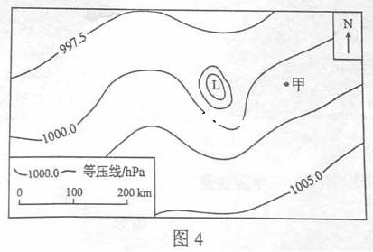 圖2示意我國(guó)某地區(qū)14日6時(shí)的氣壓形式,L為低壓,圖中天氣系統(tǒng)以200千米/天的速度東移。讀圖4,完成9~11題