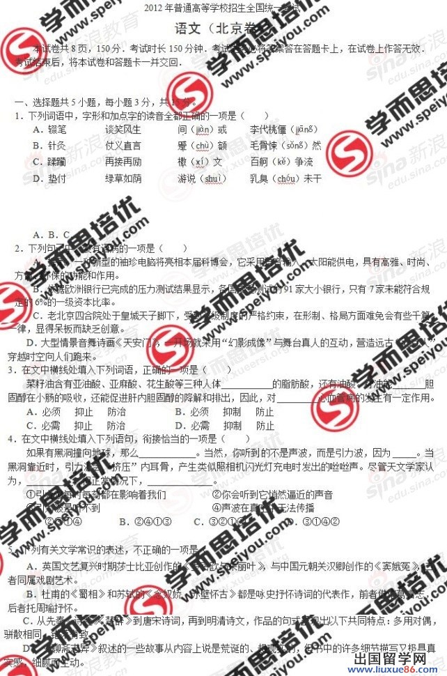 以下《2012北京高語文真題和參考答案》由出國(guó)留學(xué)網(wǎng)高考頻道為您傾情提供,希望對(duì)您的復(fù)習(xí)和模擬考試有所幫助!