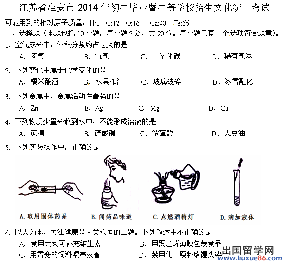 以下2014年淮安中考化學(xué)真題及答案由出國留學(xué)網(wǎng)中考頻道為您提供,希望對(duì)您有所幫助!