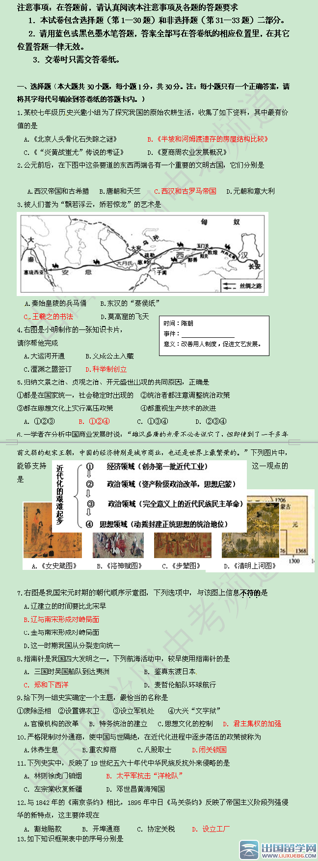 對(duì)于中考?xì)v史來(lái)說很多人都存在的誤區(qū),認(rèn)為只要死記硬背就能得高分,但是現(xiàn)在的中考?xì)v史已經(jīng)和以前的不一樣了,有很多歷史題有很多都是需要考生有自己的見解,出國(guó)留學(xué)網(wǎng)中考頻道為您提供了2015年黔南中考?xì)v史模擬試題及答案,希望對(duì)大家的歷史復(fù)習(xí)有所啟示。(附word版下載地址)