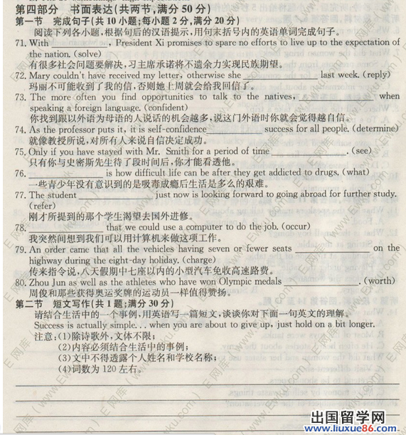 六月的高考,你是成是敗?六月的高考,你是繼續(xù)前進(jìn),還是要留下?離高考成績(jī)公布還有很長(zhǎng)的一段時(shí)間,難道大家只能焦急的等待?不,大家是可以提前做準(zhǔn)備的,大家要知道,高考結(jié)束后會(huì)公布高考真題和答案,北京的高考也一樣,出國(guó)留學(xué)網(wǎng)高考頻道會(huì)一直留意北京高考信息,會(huì)及時(shí)為廣大考生提供2014年北京英語高考作文題目,考生們?cè)谡骖}公布后可以登陸本網(wǎng)站查看,如果大家找不到自己要查看的內(nèi)容,可以按ctrl+F5進(jìn)行刷新。希望對(duì)大家有所幫助。
