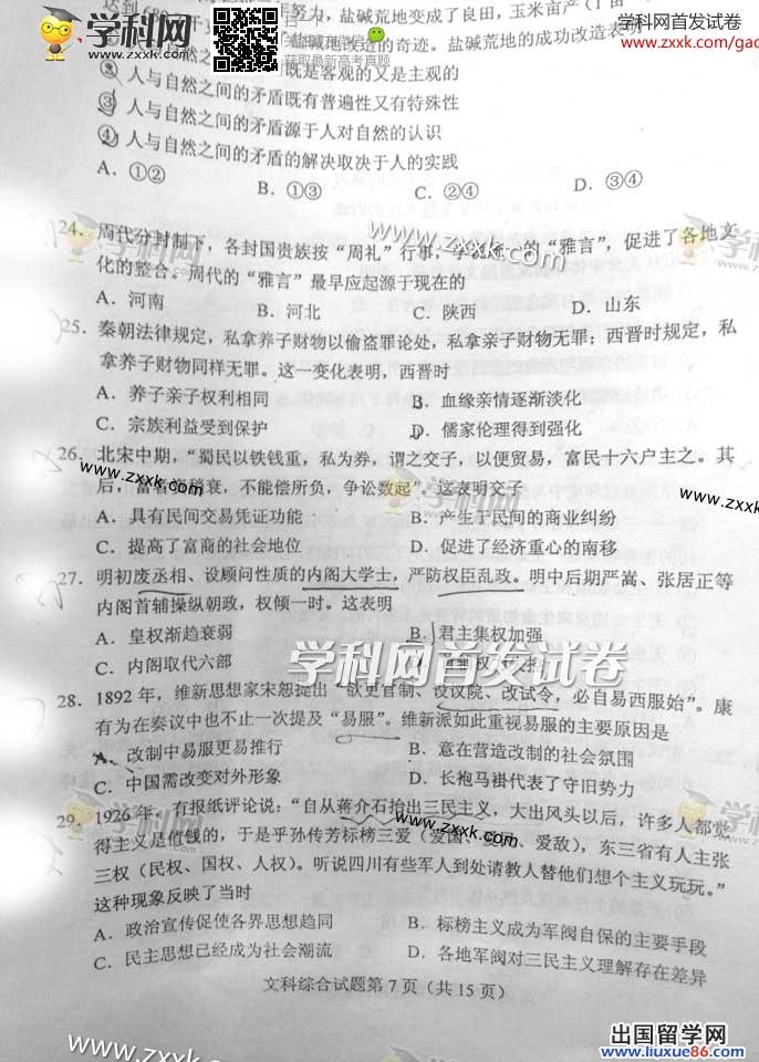 六月高考,一次站在天堂口的較量,成與敗,天堂或地獄,都是自己手掌的線,牽一發(fā)而動(dòng)全身。高考這場(chǎng)無(wú)硝煙的戰(zhàn)場(chǎng),你站在那仰望何處?出國(guó)留學(xué)網(wǎng)高考頻道第一時(shí)間為您提供2014高考新課標(biāo)2文綜真題及答案解析,讓全國(guó)各位考生更了解高考,懂的分析成敗。